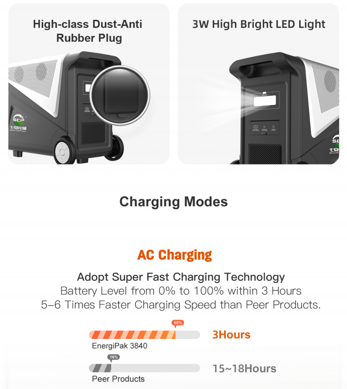 | Fast AC Charging | 3 Hours (1500W Input Power) | Rapidly recharges the massive battery capacity. |